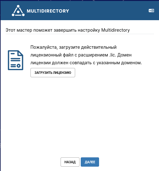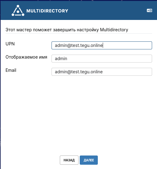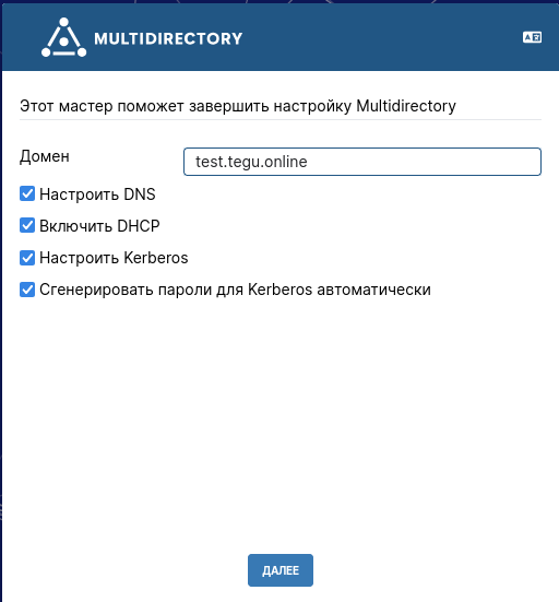 После успешной настройки и запуска сервисов Docker – перейдите в браузер. В поисковую строку внесите домен, который ранее был указан при генерации .env-файла. Вы попадете в настройку WEB-интерфейса вашей MULTIDIRECTORY. Проверьте правильность написания домена, выберите необходимые вам настройки: