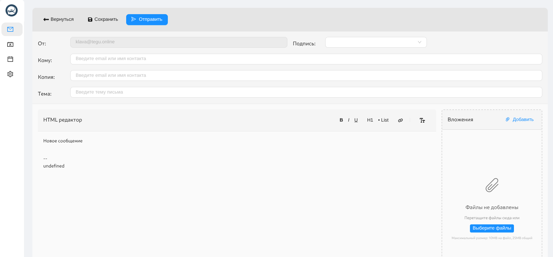 - С помощью кнопки "Выберите файлы" добавьте к письму необходимые вложения.