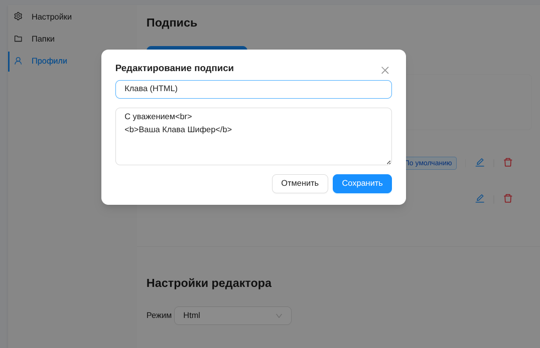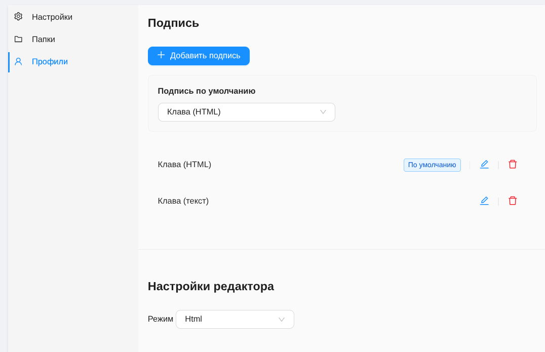 Можно создать несколько подписей, одна их которых "по умолчанию" добавляется автоматически. В любой момент вы можете изменить подпись, выбрав из списка ранее созданных.